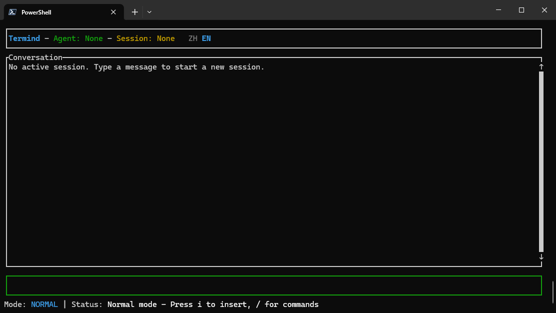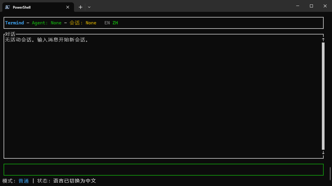 在 Normal 模式 下,用户可通过快捷键执行各类控制操作。按下 E 可切换至英文界面,按下 Z 则切换为中文界面,方便多语言使用场景。使用 j 和 k 键可上下翻阅历史消息记录,无需鼠标即可快速浏览对话内容。