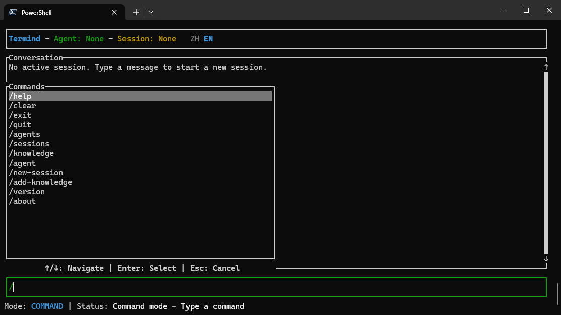 按下 / 键将进入 Command 模式 ,在此模式下可执行预设命令。支持使用上下方向键选择历史命令,回车确认执行;同时支持输入关键字进行动态过滤,快速定位所需命令,提升操作效率。