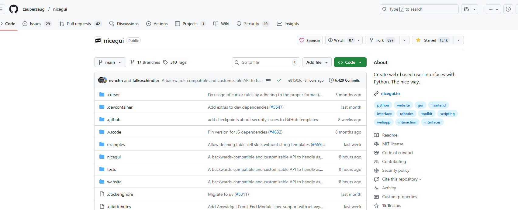 NiceGUI 提供了详细的文档和丰富的示例,帮助开发者快速上手: - 官方文档 - GitHub 仓库 - 示例项目