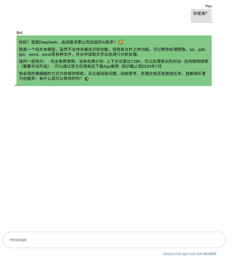 在上一篇文章《NiceGUI:用 Python 轻松构建现代化 Web UI 的全能框架》中,我们介绍了 NiceGUI 这个强大的 Python UI 框架。今天,我们将通过一个实战案例——构建一个完整的 AI 聊天应用,来展示 NiceGUI 的真正实力。