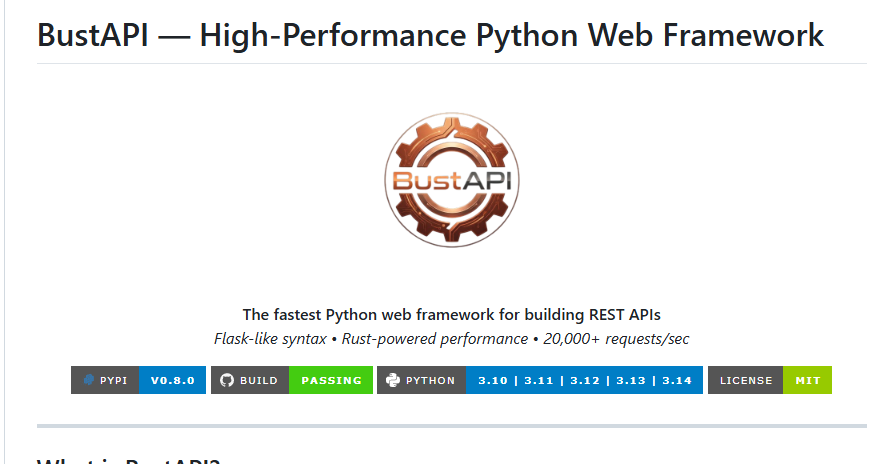 最近在 GitHub 上发现了一个让我眼前一亮的项目 —— BustAPI。一个用 Rust 核心、Python 语法的 Web 框架,号称能跑到 10 万+ RPS,这到底是什么神仙操作?